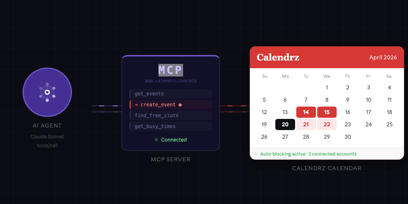 - Not tied to one AI. The Google Calendar connector lives inside Claude.ai. The Calendrz MCP server is a standard MCP endpoint, usable from Claude, from any other MCP-capable client, and from the agents you build yourself.